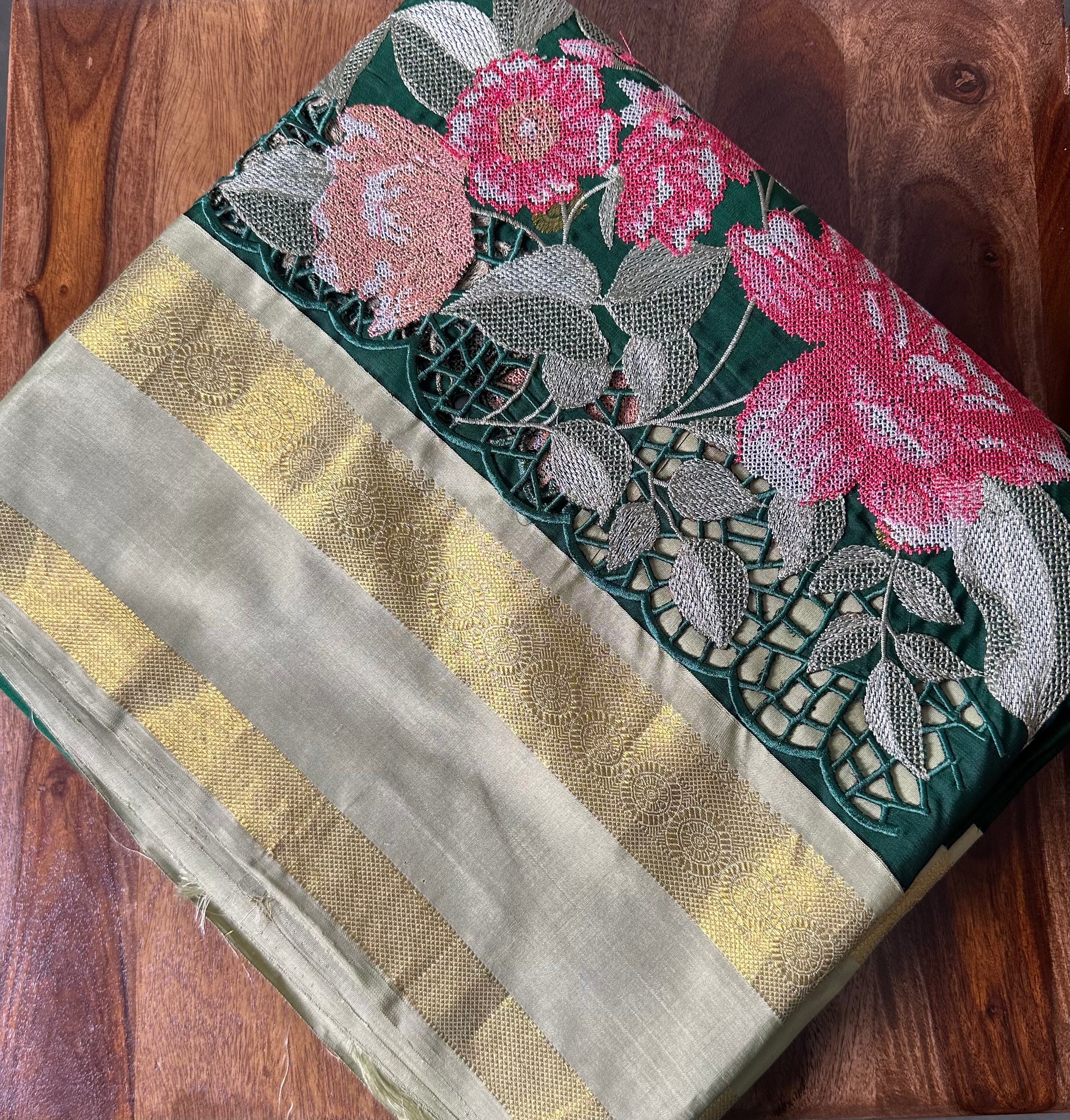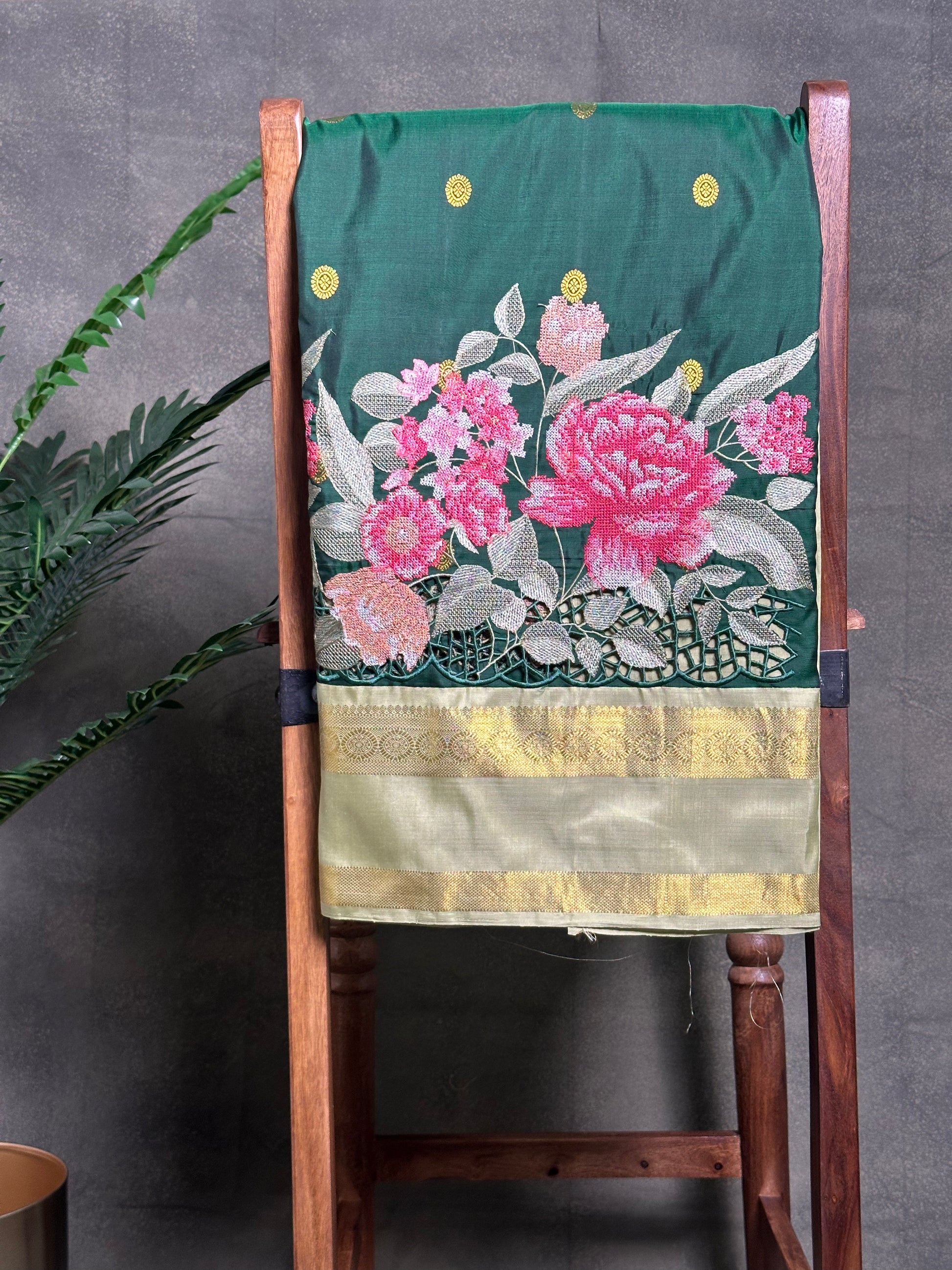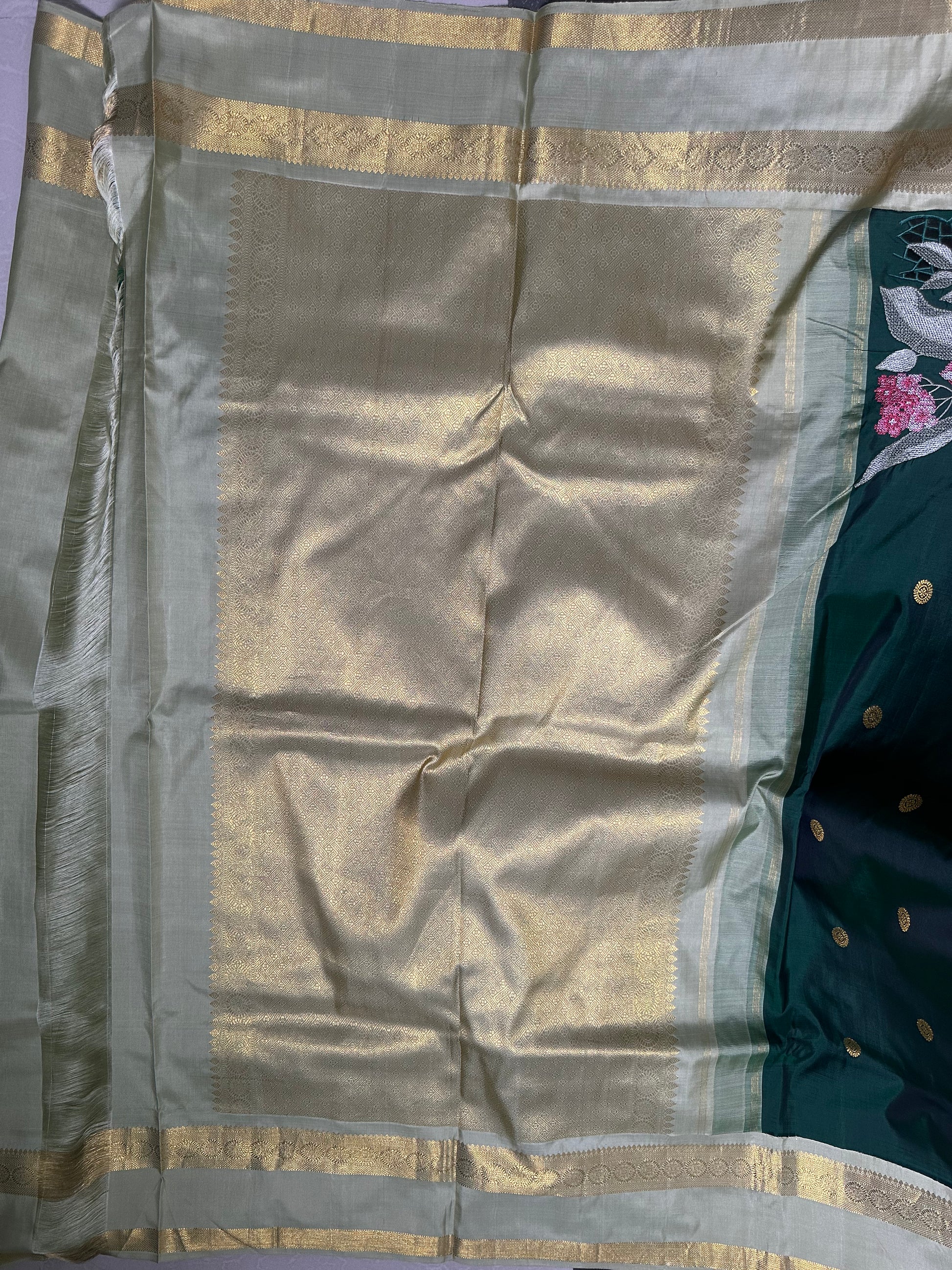 Emerald Green Pure Kanjeevaram Cut Work Embroidery Saree