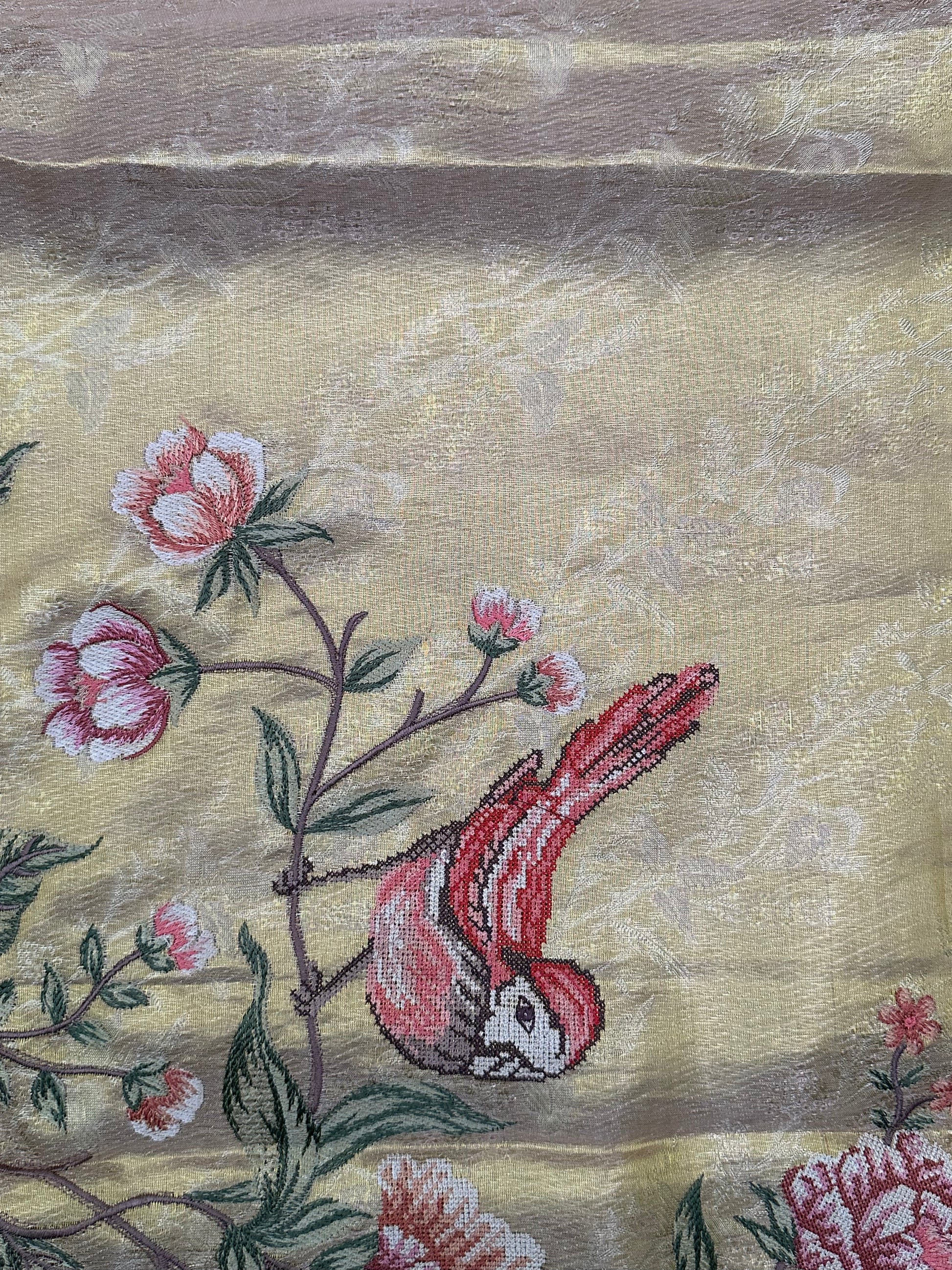 Kanjeevaram tissue self embossed weaving saree meticulously adorned with embroidery of florals and birds