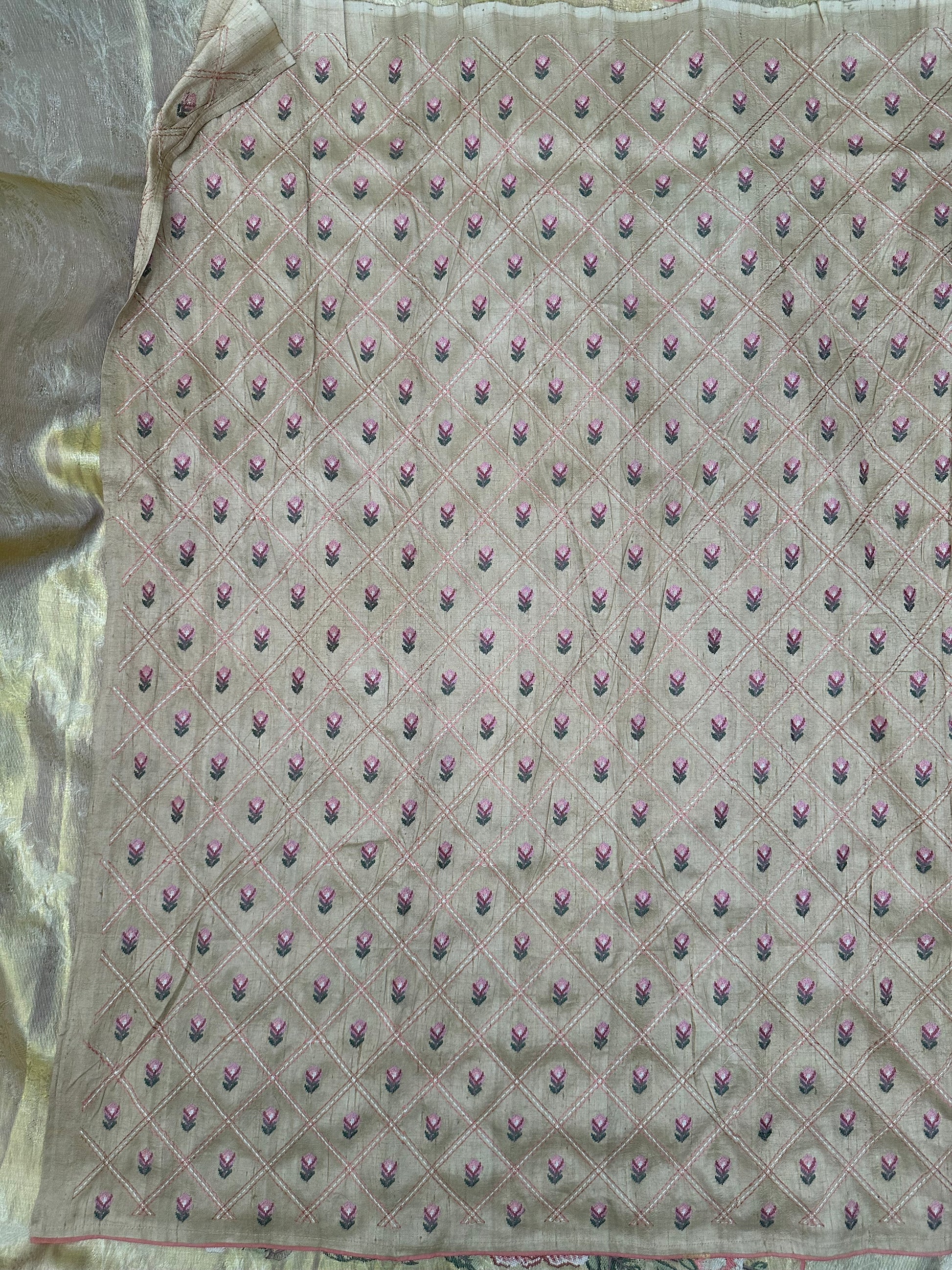 Soft drape Kanjevaram tissue handloom saree with embroidery showcase a unique blend of traditional weaving & intricate embroidery .